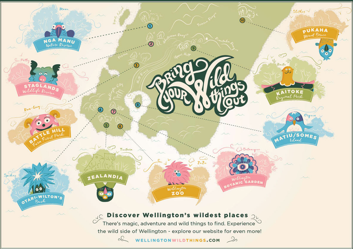 Bring Your Wild Things Out was all about encouraging families to discover Wellington’s wildest places. A collaboration with Nature Connections, we were tasked with highlighting and uniting twelve outdoor attractions across the Wellington region - including Matiu/Somes Island, Zealandia and the Wellington Zoo.