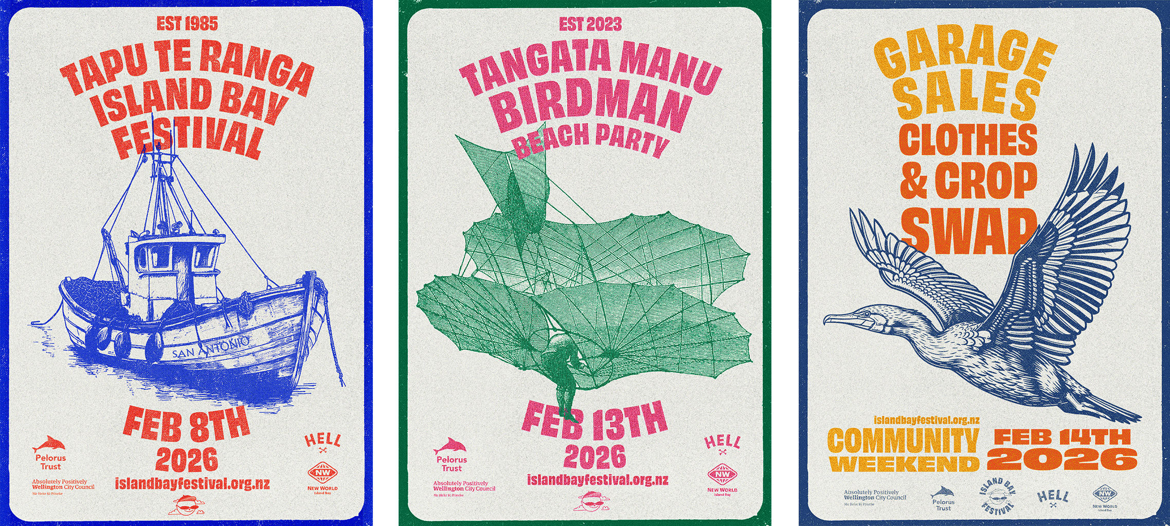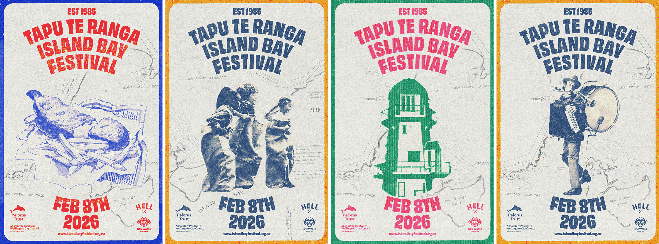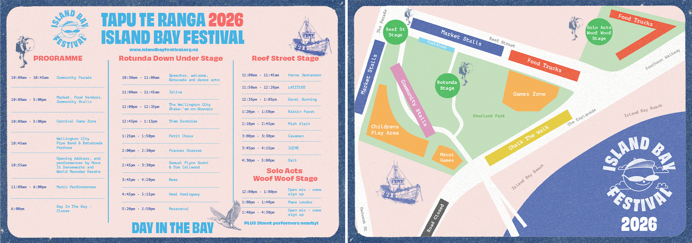 Designed as a flexible system, it can shift tone, colour, and texture to suit different events while remaining rooted in place. Inspired by the icons of Island Bay and the wild south coast, the look aims to capture the spirit of where land, sea, and community combine.