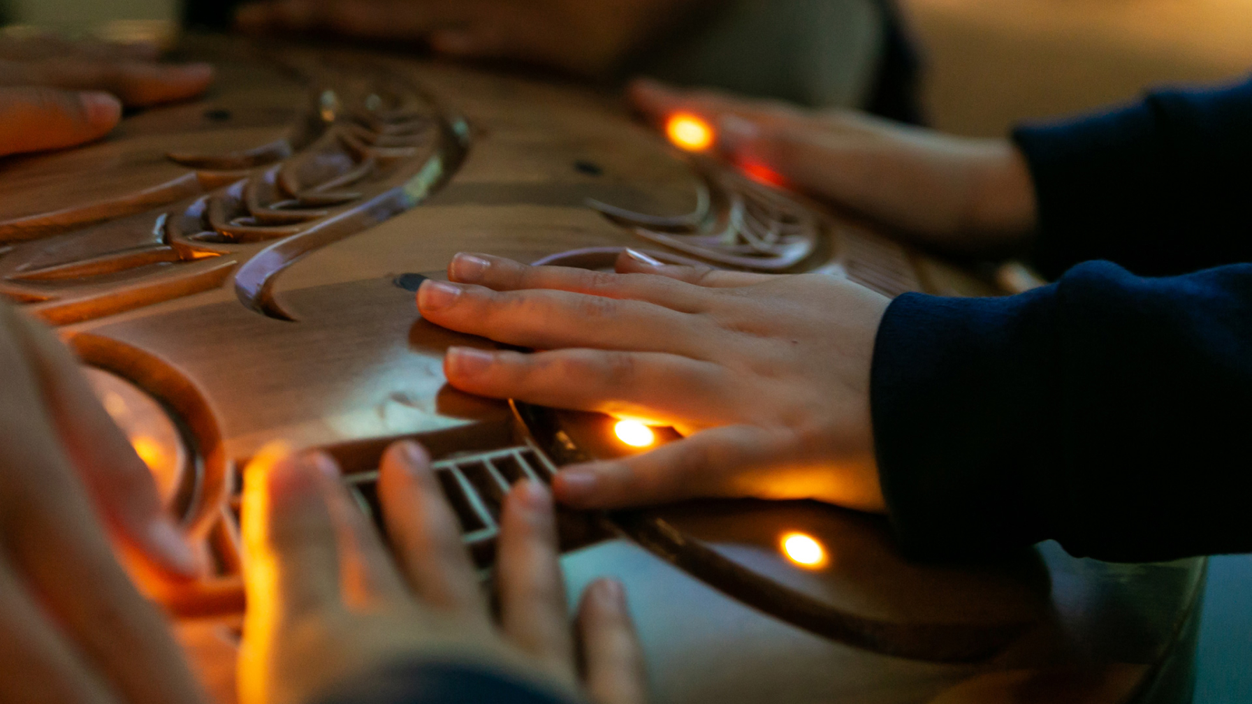 The activator communicates the idea of mauri not through words, but through action. When visitors place a hand on the carved wooden plinth, they trigger a sensor that causes an immediate onscreen effect – more life energy is manifested through thriving birds, plants, and animals. Embedded LED lights on the plinth, along with immediate audio feedback, signal clearly that the activator is responsive to touch. Trees, birds, fish, insects, plants and even fireflies all become more abundant as the scene reaches a ‘peak’ state. Each additional hand placed and held on the activator generates more mauri, until where there was once an empty ocean or forest, huge whales or lively groups of kākāpō appear.